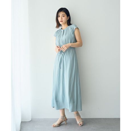 フレンチスリーブと、ギャザーを施した立体的なデザインが女性らしいシルエットを演出してくれるワンピース。