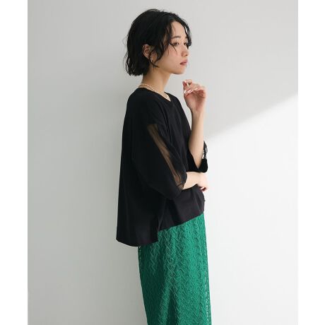 袖にライン状のチュールをドッキングしたトレンド感溢れるプルオーバー。ゆったりとしたオーバシルエット×短丈でパンツにもスカートにも合わせやすいデザインです。前後差をつけたテールロングがこなれ感を演出。上品な肌見せ感でヘルシーに着こなせる今季おすすめのトップスです。透け感[ややあり]