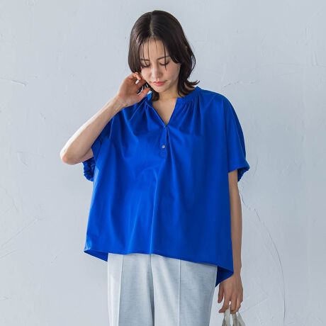 フロントはトレンドのキーホールネックに、程よいボリュームのギャザー。