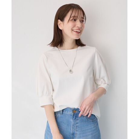 ・大人可愛いパフスリーブデザインがポイントのカットソー・カフスを広めに取りクラシカルな印象に・カットソー素材のため、フェミニン見えしすぎず着用しやすい