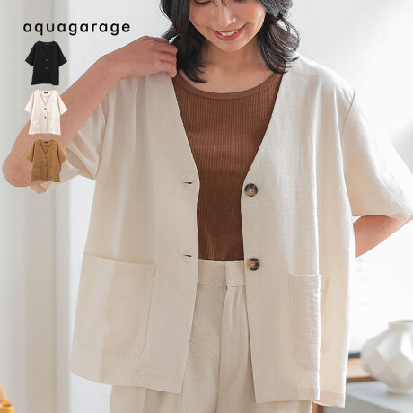 首元をすっきり見せてくれるノーカラーデザインと、程よく肩が落ちる半袖シルエットがこなれた雰囲気を演出してくれます。
