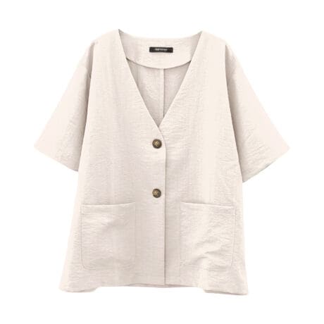 首元をすっきり見せてくれるノーカラーデザインと、程よく肩が落ちる半袖シルエットがこなれた雰囲気を演出してくれます。