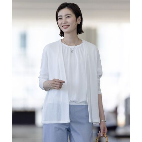 ■デザイン暑い夏に頼れる、さりげないトレンド感と体型カバーを兼ね備えたカーディガン。襟元はすっきりと仕上げ、肩にタックを施すことで程よいドレープ感が生まれ、動きのあるエレガントなシルエットになっています。前からみると普通丈のカーディガンですが、後ろは少し長めのデザインでヒップラインをさりげなくカバー。スカートにもパンツにも馴染む絶妙な丈感で、汎用性の高いアイテムになっております。初夏から初秋まで長く愛用でき、夏の冷房対策としても重宝する1枚です。
