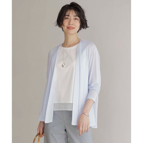 ■デザイン暑い夏に頼れる、さりげないトレンド感と体型カバーを兼ね備えたカーディガン。襟元はすっきりと仕上げ、肩にタックを施すことで程よいドレープ感が生まれ、動きのあるエレガントなシルエットになっています。前からみると普通丈のカーディガンですが、後ろは少し長めのデザインでヒップラインをさりげなくカバー。スカートにもパンツにも馴染む絶妙な丈感で、汎用性の高いアイテムになっております。初夏から初秋まで長く愛用でき、夏の冷房対策としても重宝する1枚です。