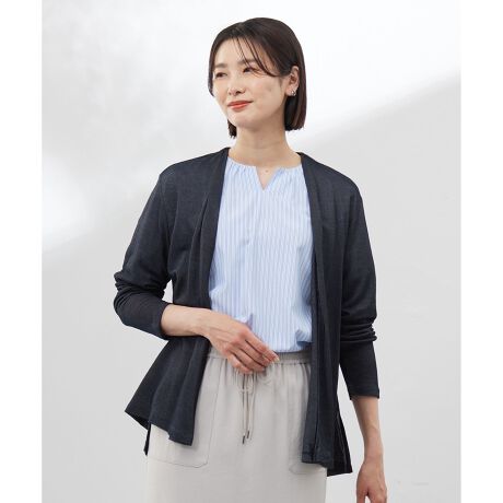 ■デザイン暑い夏に頼れる、さりげないトレンド感と体型カバーを兼ね備えたカーディガン。襟元はすっきりと仕上げ、肩にタックを施すことで程よいドレープ感が生まれ、動きのあるエレガントなシルエットになっています。前からみると普通丈のカーディガンですが、後ろは少し長めのデザインでヒップラインをさりげなくカバー。スカートにもパンツにも馴染む絶妙な丈感で、汎用性の高いアイテムになっております。初夏から初秋まで長く愛用でき、夏の冷房対策としても重宝する1枚です。