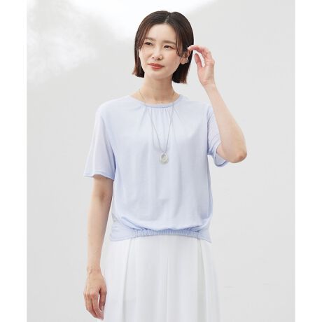 ■デザインアンサンブル風の着こなしが叶う、前裾にゴムを入れたカットソー。襟元にはさりげなく微配色の布帛をあしらい、シンプルながらも表情のある仕上がりになっています。軽やかなシアー素材を使用しつつ、身頃は二重仕立てで、透け感を気にせず着られるのも嬉しいポイント。袖は一枚仕立てで、ほんのり素肌が透けることで、夏らしい涼し気な印象を与えます。アンサンブルとして楽しめる同素材のカーディガンと合わせれば、スタイリングに奥行きをプラスし、ワンランク上の着こなしに。サラッと着るだけでセンスが光る大人のためのカットソーです。
