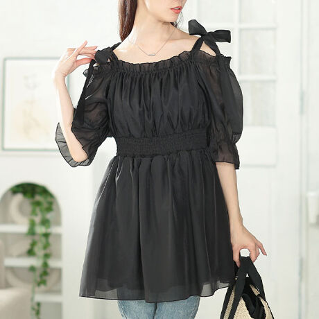 軽やかで女性らしい印象を演出する、オフショルチュニックです。ウエストはシャーリングを施し、程よくフィットしてくびれを作ってくれます。肩紐はリボン結びになって顔周りのアクセントに。広めのネックラインで美デコルテ&顔周りにすっきり感を出してくれます。シアー生地のチュニックはエアリー感もたっぷり。ギャザーをたっぷり入れてふんわり感をアップ。気になる腰回りを隠す着丈、ふんわり袖で体型カバーもばっちり。デイリー使いはもちろん、ちょっとしたお出かけにもぴったりの一枚です。