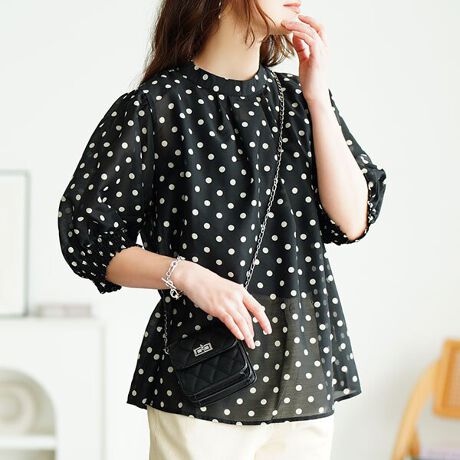 レトロでチャーミングな甘さ漂うドット柄が可愛いブラウス。甘めのスタイリングを楽しむならドット柄がおすすめ♪ベーシックなパレットの配色でデザインされたドット柄だから甘くなり過ぎず、大人世代にもぴったり。ふんわりとボリューム感のあるシルエットで上品さも演出します。ボリューム袖やネックラインに配されたタックで、ふんわりとしたシルエットに。上品な甘さが引き立ち、ゆったりとした着心地だからストレスフリーに体型カバー。首元の後ろにはボタン付きだから着脱もしやすく、袖口にはゴム入りでふんわり感アップ。