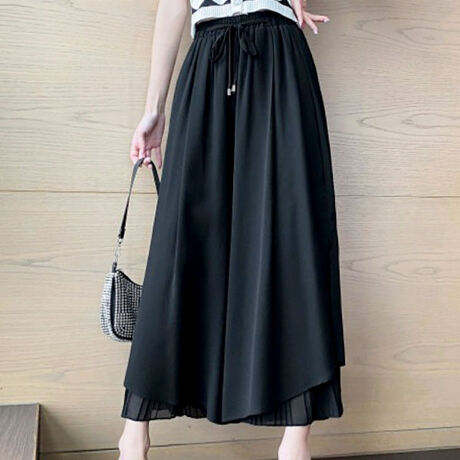 ふんわり揺れて、体型カバーばっちり。美しく魅せるガウチョパンツです。総ゴム+引き紐付きのウエストで楽ちんな穿き心地。軽やかにゆれるシフォンが歩くたびにエレガントな印象。透け感のあるシフォンの下はプリーツになったお洒落デザイン。シフォンはスリット入りで、プリーツラインがちらっと見えるのがポイント。Aラインに広がるシルエットなので、脚のラインを拾わないのも◎きれいめ&カジュアルにもマッチ、どんなコーデにも女性らしさをプラスしてくれる頼れる味方服です。