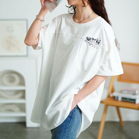 可愛いわんちゃんたちのプリントチュニックTシャツ。胸ポケット部分に描かれたサマーバケーションなドッグプリント!帽子やサングラスをかけた犬たちがキュートなアイテムです。背中側には犬たちの後ろ姿があり、どこから見ても可愛さ満載!ゆったり身幅&チュニック丈で体型カバー効果◎バックフェイクボタン付きで後ろ姿までお洒落見え。素肌にうれしい綿100%のコットンカットソー生地で着心地も快適です。