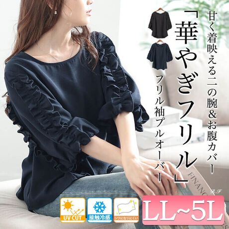 【大きいサイズ】 接触冷感&UVカットフリル袖タックペプラムプルオーバー 大きいサイズ レディース