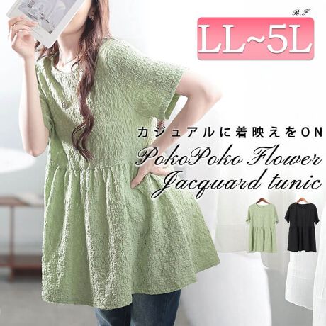 動くたびふわり可憐に揺れるポコポコ花柄ペプラムチュニックハイウエスト位置からフレアペプラムデザインで気になるぽっこりお腹&ヒップラインをふわりとカバーします♪体型を拾わないゆったり身幅&袖幅でリラクシーなサイズ感でご着用いただけます◎ほんのり透け感のある花柄ジャガードでシーズンムード高まる涼しげな肌見せスタイルをお楽しみください☆