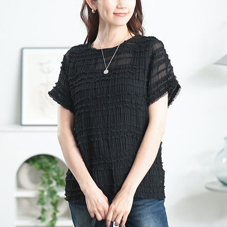 シフォン生地にたっぷりギャザーを寄せたシャーリング生地が立体感をつくり、一枚で着映えるカットソーは、シンプルながらも女性らしい存在感を発揮します。透け感のあるシフォン素材が季節感をプラスし、コーデを盛り上げてくれる一枚。たっぷりギャザーで伸縮性も良く、コンパクトな見た目ながらも窮屈感のない着心地。さり気ないフリル感とシャーリング生地の立体感で体型を上手に隠してくれます。タックインでもアウトでもサマ見えする、すっきりとした丈感でボトムスを選びません。