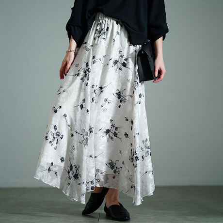 水彩で描かれたようなリッチな花柄が高見え効果を発揮し、ジャガードリーフが立体感をつくり表情あるシフォンの生地が奥行きをプラスします。ランダムなヘムラインが足下に抜け感を演出し、爽やかなシフォン生地が軽快なスタイリングに仕上がる大人なフレアスカート。4枚はぎで展開されるフレアデザインでボリューム感たっぷりだから下半身を体型カバー。ヒップ周りに切り替えが配され、ヒップのボリュームを抑えてくれるから綺麗なシルエットに。サテン地の裏地付きで透ける心配もなく、滑らかな肌あたりで快適に。