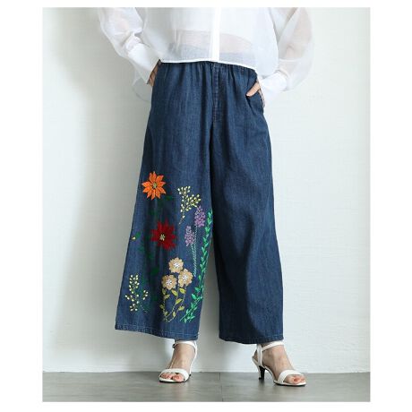 【パンツ】 ボトムス ズボン 青 ブルー 紺 ネイビー ロング丈 デニム 刺繍 花柄 ワイド 綿 春