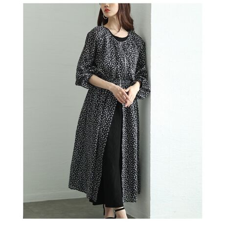 【ワンピース】 チュニック 黒 ブラック 長袖 花柄 ロング丈 羽織り フレア ジップアップ 重ね着