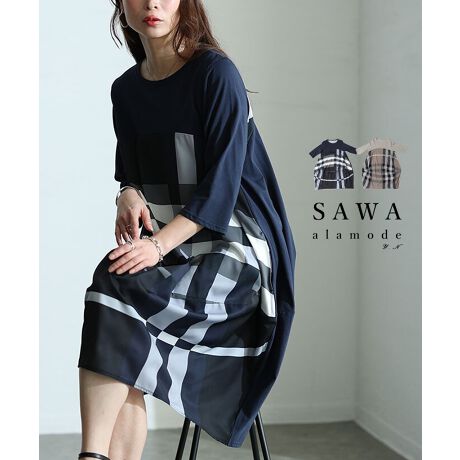 【ワンピース】 チェック カットソー コクーン ミドル丈 7分袖 ポケット グレー ネイビー 春 秋