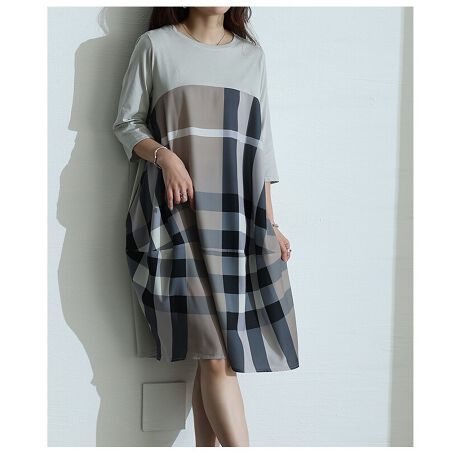 【ワンピース】 チェック カットソー コクーン ミドル丈 7分袖 ポケット グレー ネイビー 春 秋
