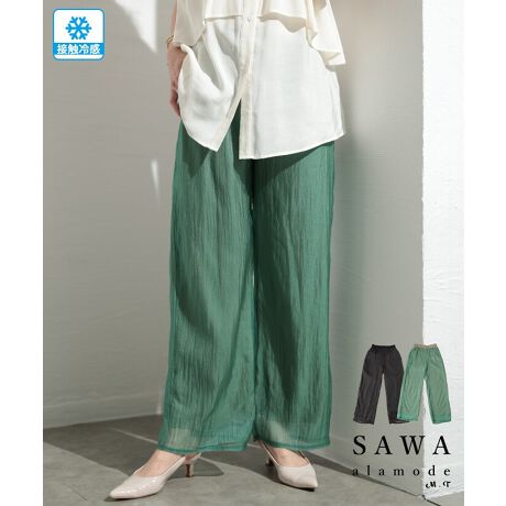【パンツ】 シフォン 異素材 ウエストゴム ドロスト セミワイド ロング 接触冷感 黒 緑 春 夏