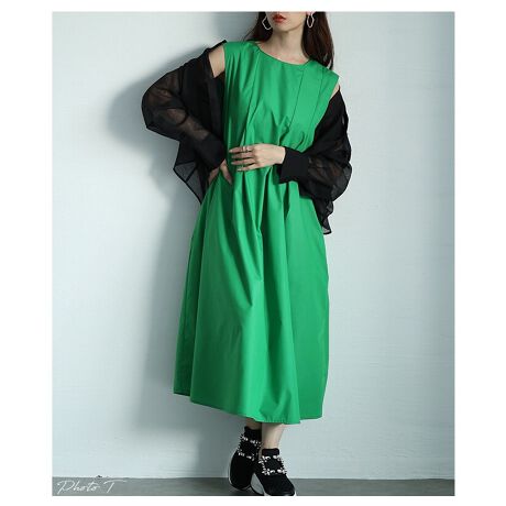 【ワンピース】ミディアム ロング ノースリーブ フレア グリーン 緑 ブルー 青 レディース 可愛い