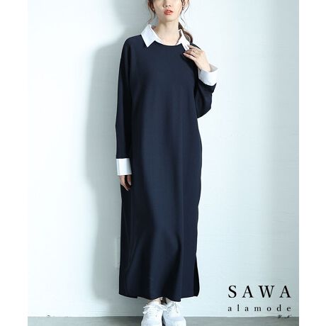 【ワンピース】レディース ファッション ポロ ロング 長袖 紺 ネイビー バイカラー 無地 トラッド