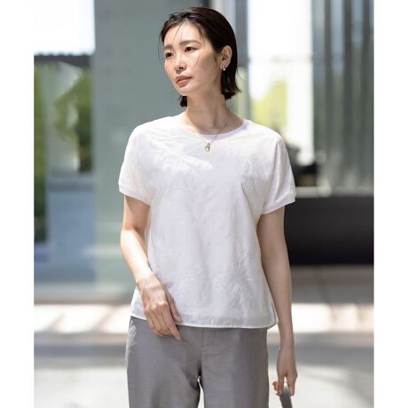 ■デザインシアーな刺繍生地が涼しげに映える、フレンチスリーブのカットソー。繊細な刺繍と程よい抜け感が軽やかな夏のスタイリングを演出します。襟元と袖口にはニット編みを施し、柔らかなアクセントを加えつつ、同色の刺繍がシンプルながらも品のある印象を与えます。暑い季節にぴったりな1枚で、後ろ身頃は透けないジャージ素材を使用しているため、ストレスフリーな着心地が魅力です。日常使いからお出かけまで、涼しく快適に過ごせるアイテムです。