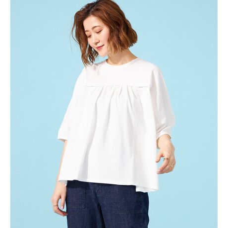 胸元のギャザーデザインと、丸みのあるパフスリーブが、フェミニンな印象をプラス。高めの位置に入れた切り替えは、バストトップを高く見せる視覚効果があり、スタイルアップも叶えます。
