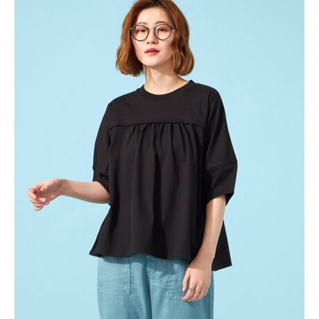 胸元のギャザーデザインと、丸みのあるパフスリーブが、フェミニンな印象をプラス。高めの位置に入れた切り替えは、バストトップを高く見せる視覚効果があり、スタイルアップも叶えます。