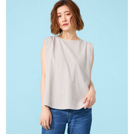 暑い季節を快適に、そしておしゃれに過ごせるノースリーブトップス。サッカー素材を使用し、コットン側を染めることで、ストライプがまるで浮かび上がって見えるような、涼しげなデザインを実現しました。