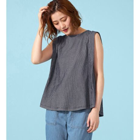 暑い季節を快適に、そしておしゃれに過ごせるノースリーブトップス。サッカー素材を使用し、コットン側を染めることで、ストライプがまるで浮かび上がって見えるような、涼しげなデザインを実現しました。