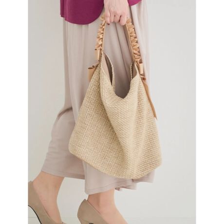 フリルハンドルが愛らしいアクセントをプラスする手下げバッグ。
