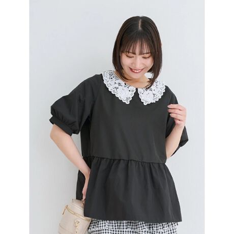襟レースがクラシカルな甘さをプラスするペプラムトップス
