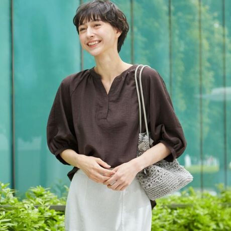 顔周りをすっきりと見せてくれるスキッパー襟にボリュームのある袖がポイントのブラウス。二の腕カバーできる五分袖です。