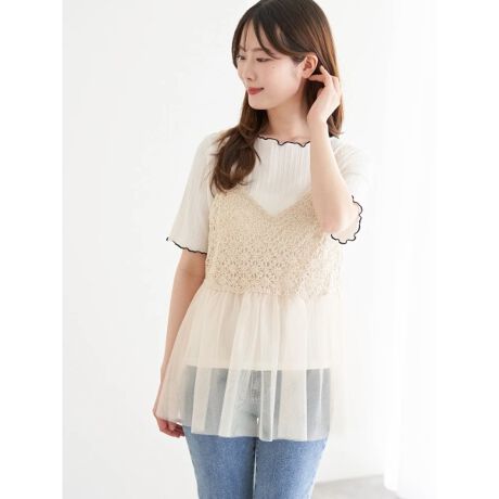 かぎ針編みとチュールフリルをドッキングしたシーズンライクなキャミソール
