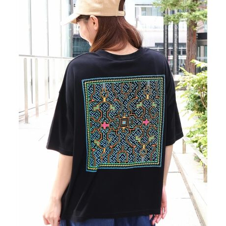 ペルー・アマゾンの先住民族シピボ族の神秘的な刺繍の幾何学模様をバックプリントに。