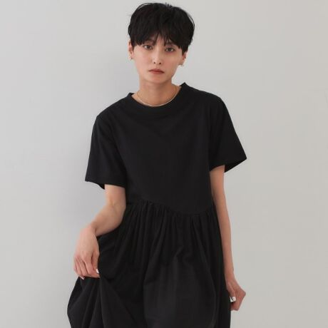 ・程よい厚みと滑らかな肌触りのTシャツ素材とスカート部分にツヤと落ち感のある別素材を使用。