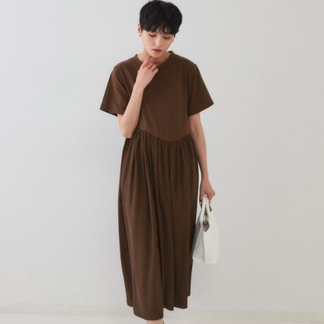・程よい厚みと滑らかな肌触りのTシャツ素材とスカート部分にツヤと落ち感のある別素材を使用。