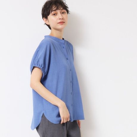 【洗える】バンドカラー袖ギャザーブラウス