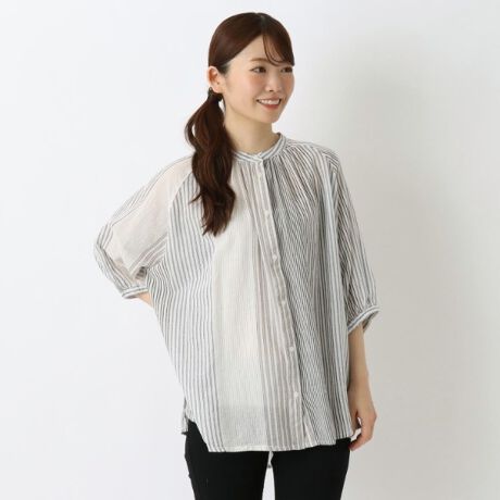 コットンガーゼのやわらかな素材と6分袖が、秋口にぴったりです。ゆったりサイズで後ろの丈が前よりやや長くなっていて、とても気に入っています。グリーンのランダムなストライプの中にブルーのストライプも入っていて、とてもオシャレです。