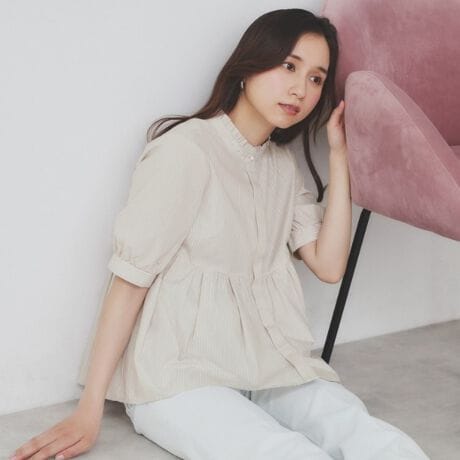 フリルバンドカラーのペプラム五分袖ブラウス