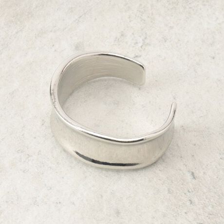 大胆な大きめデザインのメタルバングルは、スタイリングの主役として存在感を発揮します。