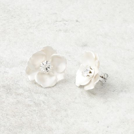 華やかなフラワーデザインのピアスは、花びらの形状と中心に輝くクリスタルが印象的。