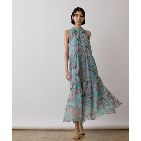 リゾート気分高まる、華やかなプリントマキシドレス。 さらっと気持ち良く着て頂ける、ふわっと軽いスパンボイル地を使用。そこにのせた、夏にぴったりなワクワクするような柄が映える一枚です。肌離れがよくゆったりとした開放感のある着心地で、汗ばむ季節でもストレスのない着心地。トレンド感のあるホルターネック仕様にしつつ、あえて詰まりすぎないよう絶妙にゆとりを持たせて着やすく仕上げています。蹴廻したっぷりの迫力のある贅沢なマキシ丈で、大人なムード漂う一枚に仕上げました。バックネックに添えたリボンは取り外し可能もでき、お好みによってアレンジも自在です。