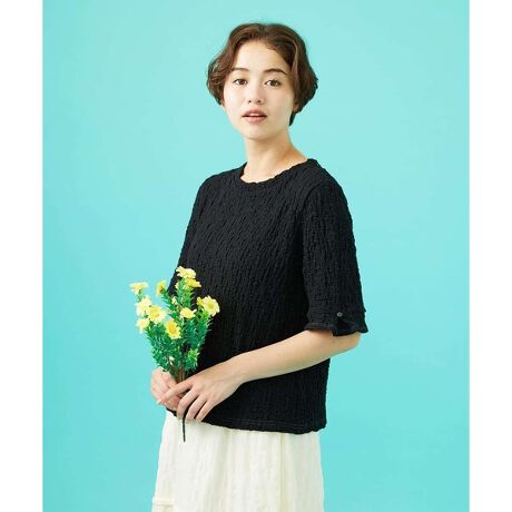 クシュクシュとした表情豊かなTシャツ。ユニークな素材を活かしたベーシックなシルエットです。着回ししやすいプルオーバータイプ。セットインスリーブでレイヤードもしやすく、長めの半袖は気になる二の腕をすっぽりと覆ってくれるデザインです。袖口のタックと飾りボタンのさり気ないデザインにも注目。
