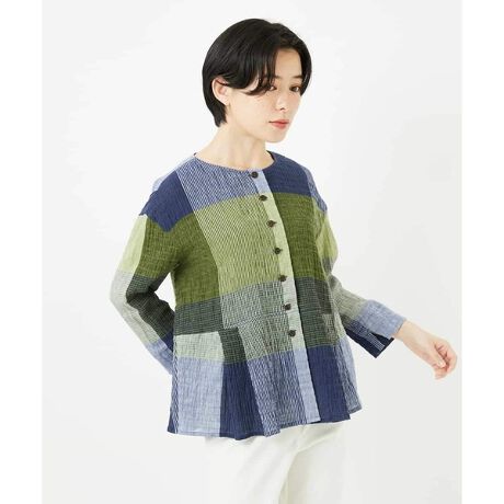 ランダムなチェック柄を生かした前開きノーカラーブラウスです。