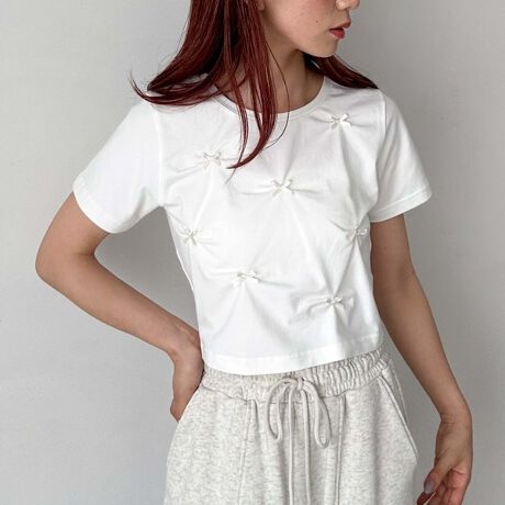 小さく絞ったデザインがシンプルなTシャツをトレンドトップスに見せてくれます。