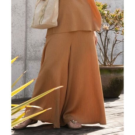 [型番:4CA-5225-2025]プリーツカットソー生地のフレアパンツ。後ろがゴムになっており、穿き心地がよく、上品なシルエットがポイントです。トップスとのセットアップ着用もおすすめ。