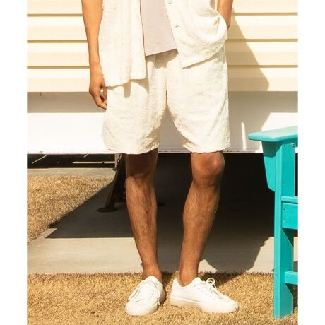 [型番:4CH-5210-2025]涼しげなオリジナル柄のパイル生地を使用したメンズハーフパンツ。リラックス感のある雰囲気でTシャツなど同シリーズのトップスとのセットアップ着用もおすすめ。