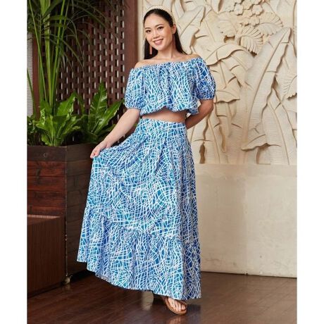 オンショルダー、オフショルダー、ワンショルダーとアレンジ自在のセットアップドレス。ナル(波)をイメージした爽やかな総柄は上品なスタイルを演出してくれます。セットアップは勿論、お手持ちのアイテムと組合せて多彩なコーディネートをお楽しみいただけます。リゾートウェアからブライズメイドやフラステージのチームドレスとしてもおすすめです。トップスは襟周りと袖口がゴム仕様になっており、スカートは前面に大胆なタック、背面にはたっぷりのシャーリングでボリュームのあるシルエットに。
