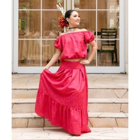 オンショルダー、オフショルダー、ワンショルダーとアレンジ自在のセットアップドレス。ナル(波)をイメージした爽やかな総柄は上品なスタイルを演出してくれます。セットアップは勿論、お手持ちのアイテムと組合せて多彩なコーディネートをお楽しみいただけます。リゾートウェアからブライズメイドやフラステージのチームドレスとしてもおすすめです。トップスは襟周りと袖口がゴム仕様になっており、スカートは前面に大胆なタック、背面にはたっぷりのシャーリングでボリュームのあるシルエットに。
